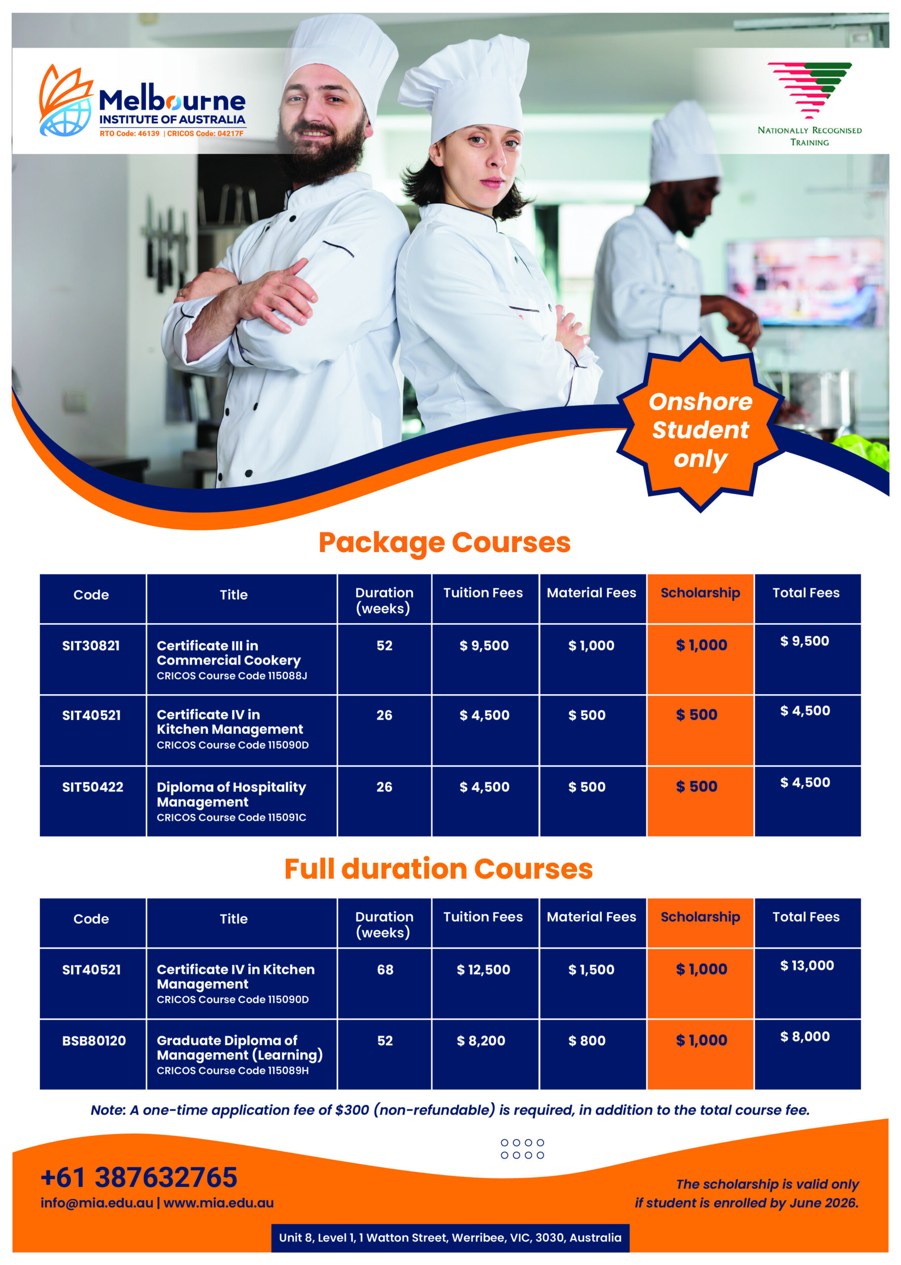 CAMPUS LOCATION Main Campus: Unit 8, Level 1, 1 Watton Street, Werribee, VIC, 3030 Training Kitchen: Shop 16-18, 47 Paisley Street, Footscray, VIC, 3011 Contact Us Unit 8, Level 1, 1 Watton Street Werribee, VIC, 3030 AUSTRALIA info@mia.edu.au +61 387632765 Gain practical skills and real-world experience to build a brighter futureStart your academic journey with Melbourne Institute of Australia Apply Now